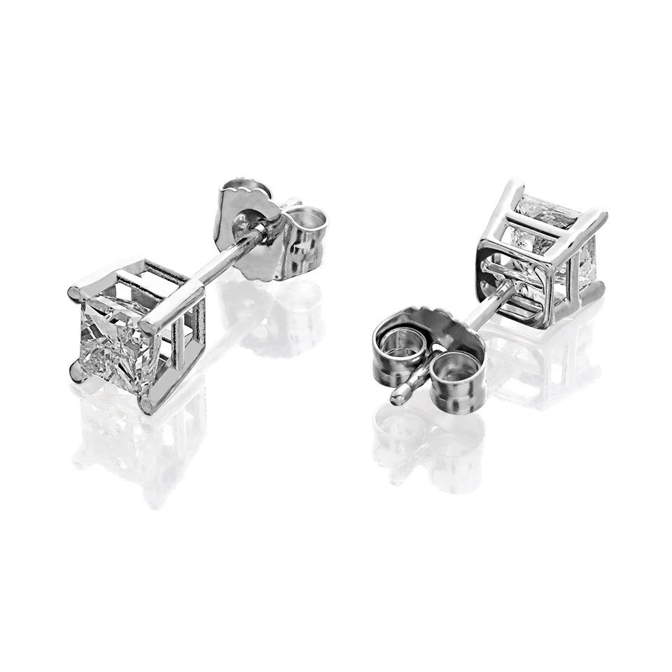 Featuring two beautiful princess cut diamonds, these classic 14ct white gold diamond solitaire stud earrings are simple but elegant. Total diamond weight 3/4ct for the pair, fitted with 14ct gold butterfly scrolls. Independently certificated by the AGI (Antwerp Gemmological Institute) as colour I, and clarity I1 as a minumum.