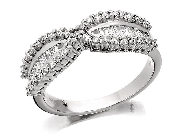 A pretty bow ring with baguette cut diamonds in the centre, plus round brilliant cuts on the edges and at the crossover (1/2ct total diamond weight). Available in selected sizes only.