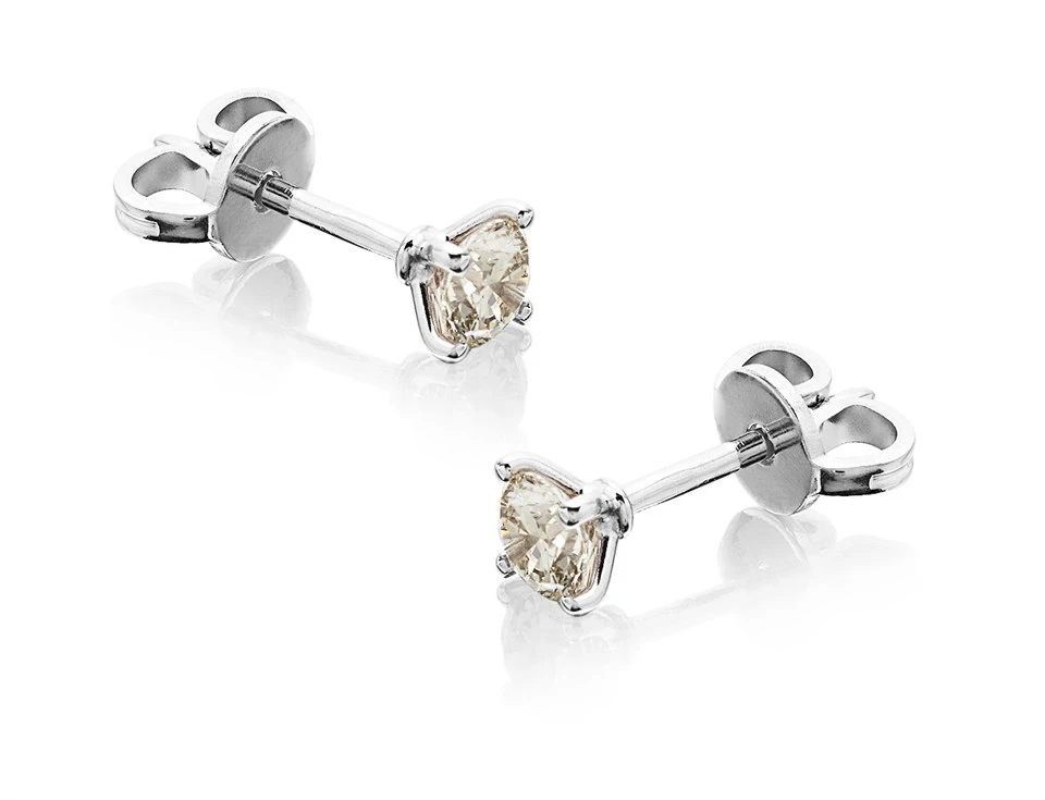 Classic and perfect for any occasion, these elegant diamond solitaire stud earrings feature two, 20pt round brilliant cut diamonds set in 18ct white gold four claw settings. Secured with 18ct white gold butterfly backs, 40pts total diamond weight for the pair.