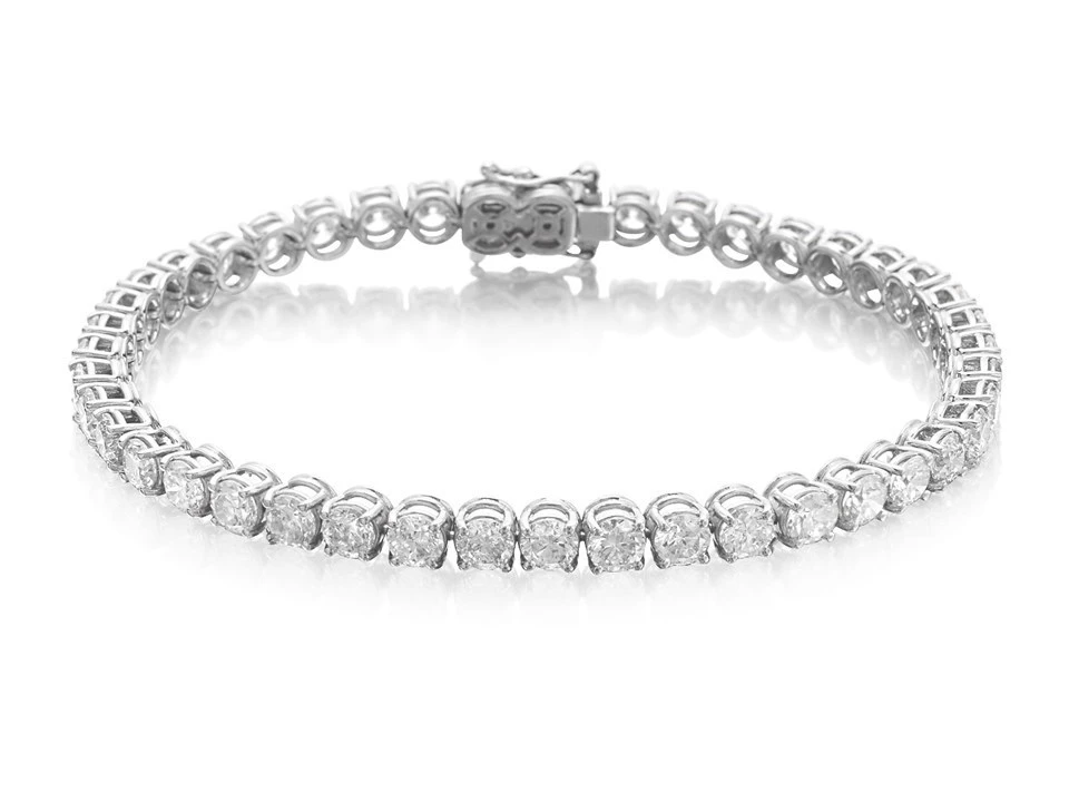 A classic white gold tennis bracelet created from 58 bright white diamonds set in 18ct white gold. Finished with a secure double safety clasp, the combined total diamond weight is a minimum of 5.3 carats, but may total as much as 6 carats. Made to order in the UK and subject to availability, we will need to source each individual diamond to ensure they are perfectly matched in size and appearance.