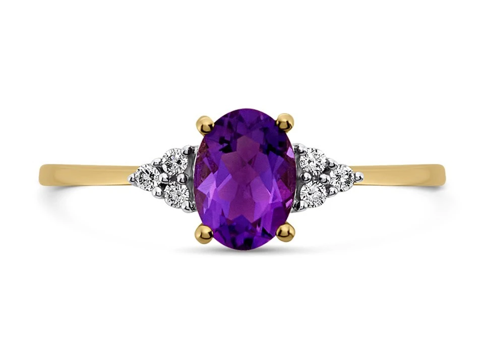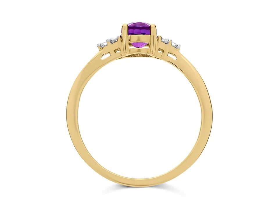 A stunning 5 x 7mm oval cut purple amethyst sits in the centre of this ring, with three cubic zirconias accenting it on each side. Exclusive to F.Hinds in the U.K.