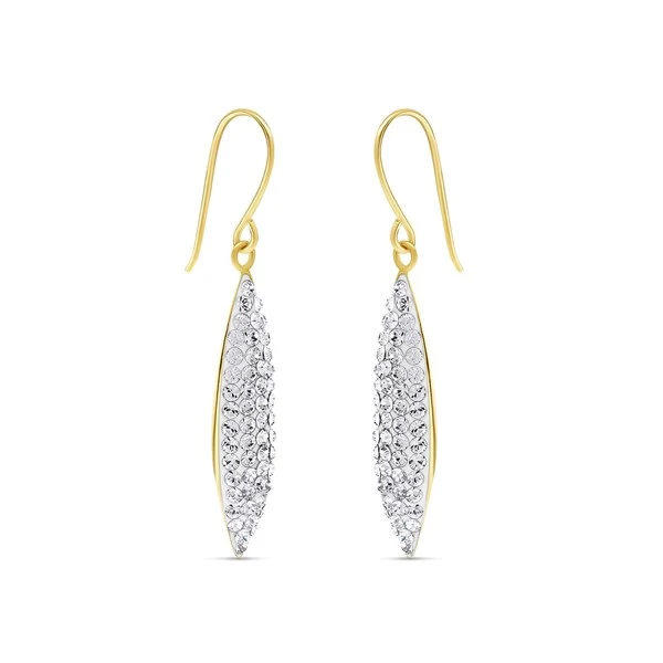 These 9ct gold hook wire earrings have a 23 x 5mm ellipse of crystals to radiate sparkle. Total drop 33mm and secured with comfortable hook wires. To keep this piece of jewellery looking beautiful, we recommend you remove it before showering and swimming. Full care information can be found here.