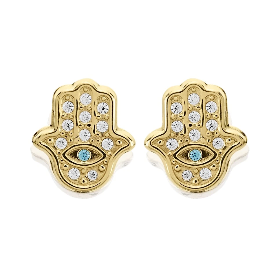 Set with white cubic zirconias and a blue one at the centre, these 8 x 7mm 9ct gold stud earrings have a hamsa hand design. Secured with gold butterfly fittings.