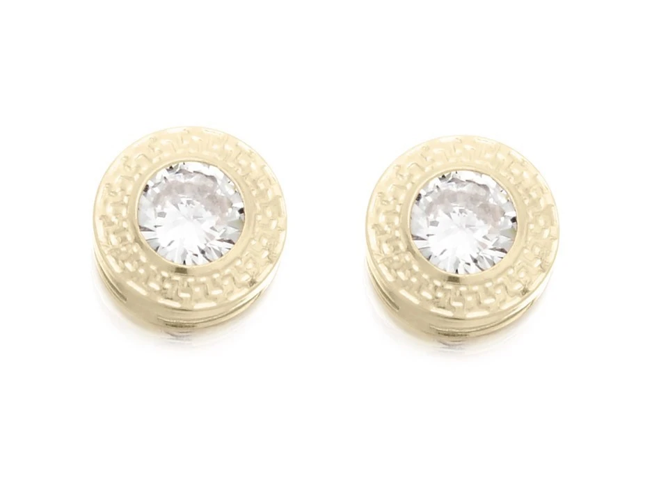 The 3.5mm large, white cubic zirconias at the centre of these studs are edged by swirled 9ct gold to create these interesting 7mm wide stud earrings, wearable at any time, for any occasion.