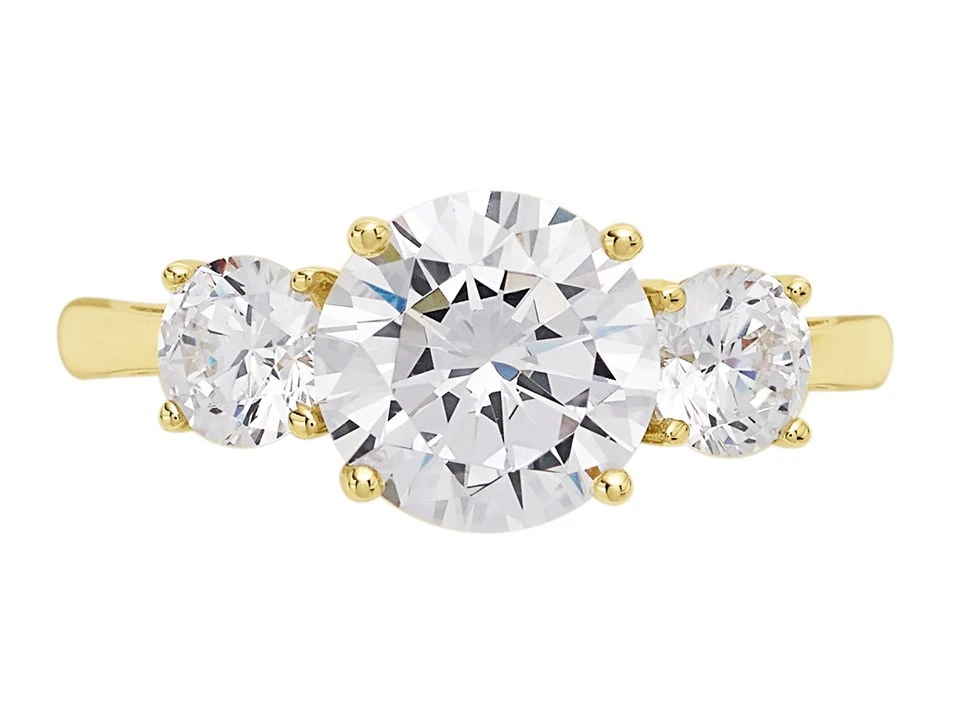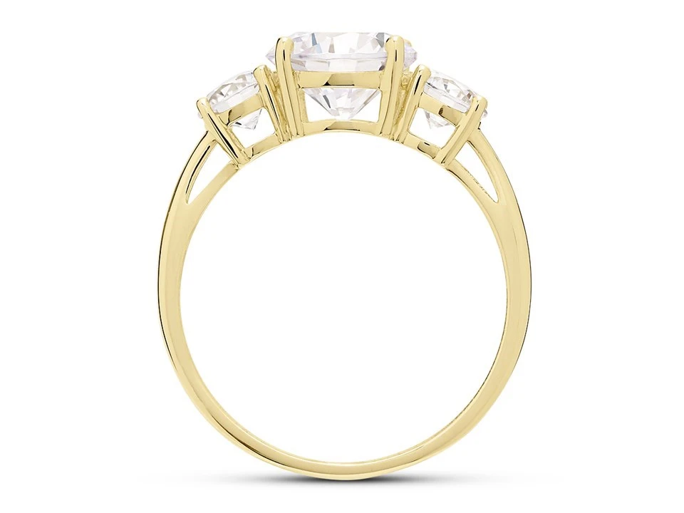 A classic 9ct gold cubic zirconia three stone ring representing the past, present and future. The centre 8mm stone has 4mm stones either side to create an eye-catching sparkly ring with a slim gold band.