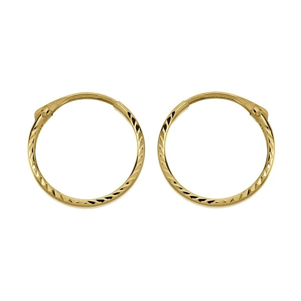 The diamond cut patterning on one side of these 12mm diameter hoop earrings makes them perfect for newly pierced ears. Made in the UK.