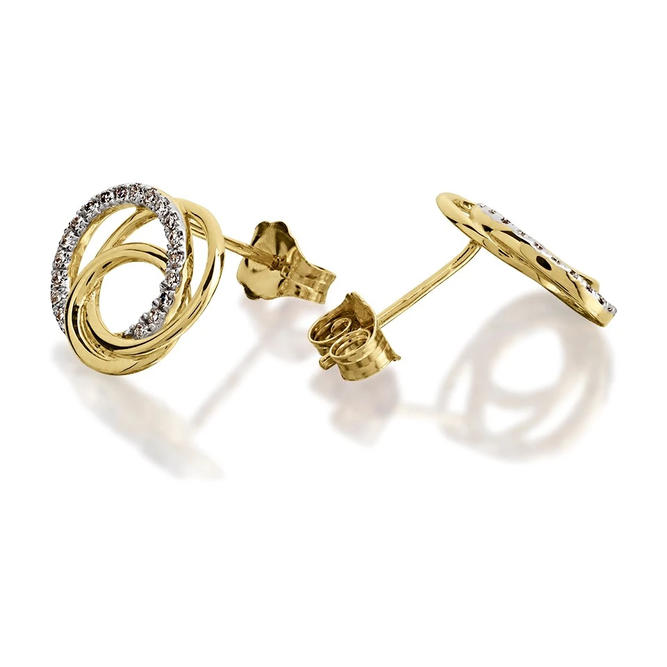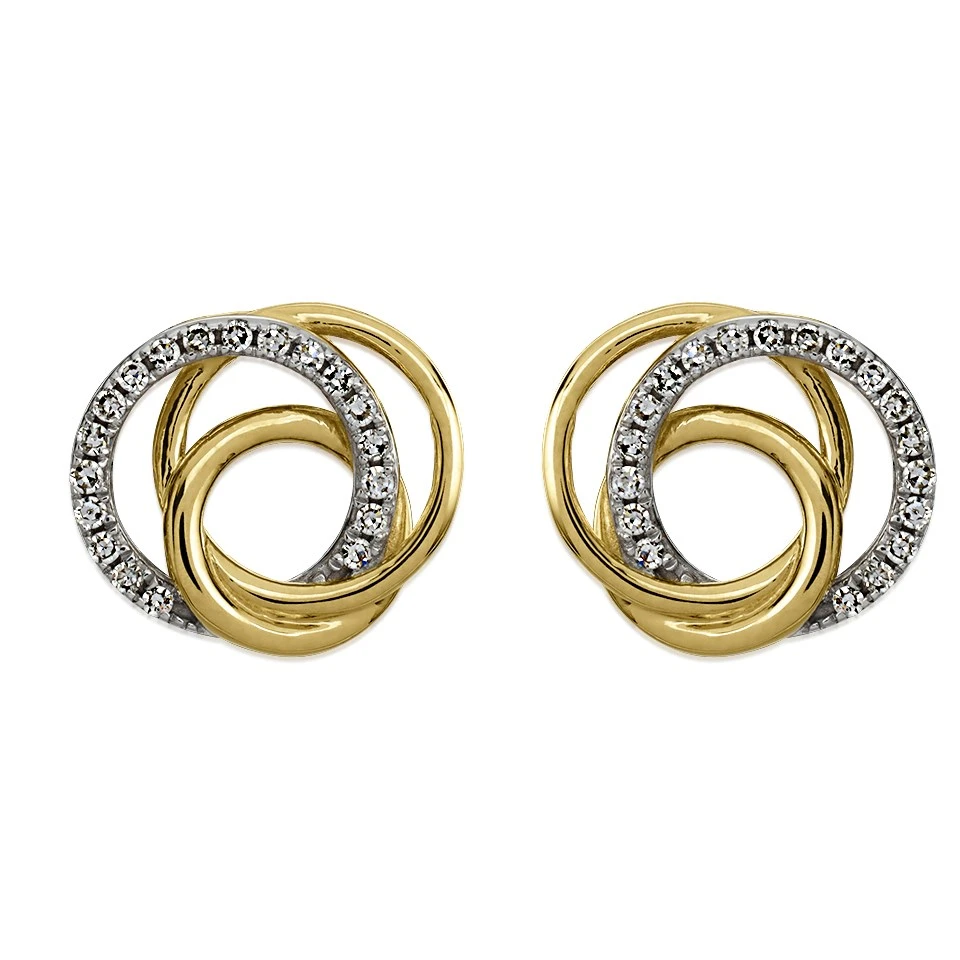 These 12mm wide 9ct gold diamond set open knot stud earrings will make a lovely addition to any jewellery collection. 15pts total diamond weight for the pair, secured with gold butterfly fittings.