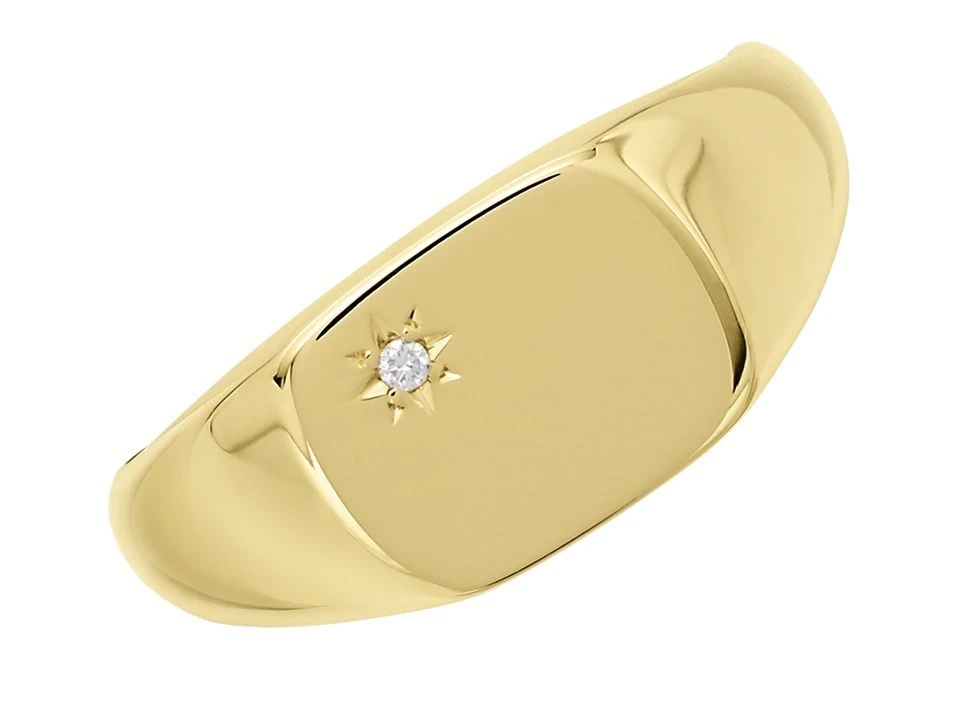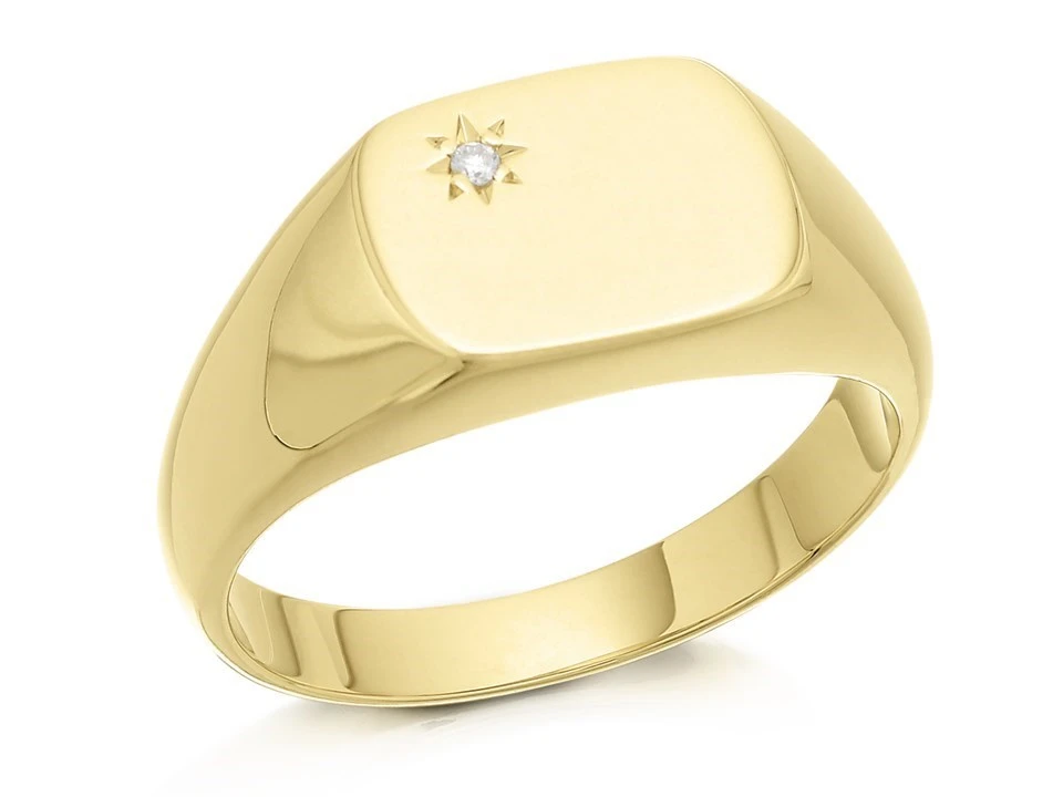 The 12 x 10mm rectangular shield of this signet ring sparkles with a diamond at one corner, leaving sufficient space for engraving over the rest of the plain panel (engraving at extra cost, must be arranged in store). The gold band narrows at the back for a comfortable fit.
