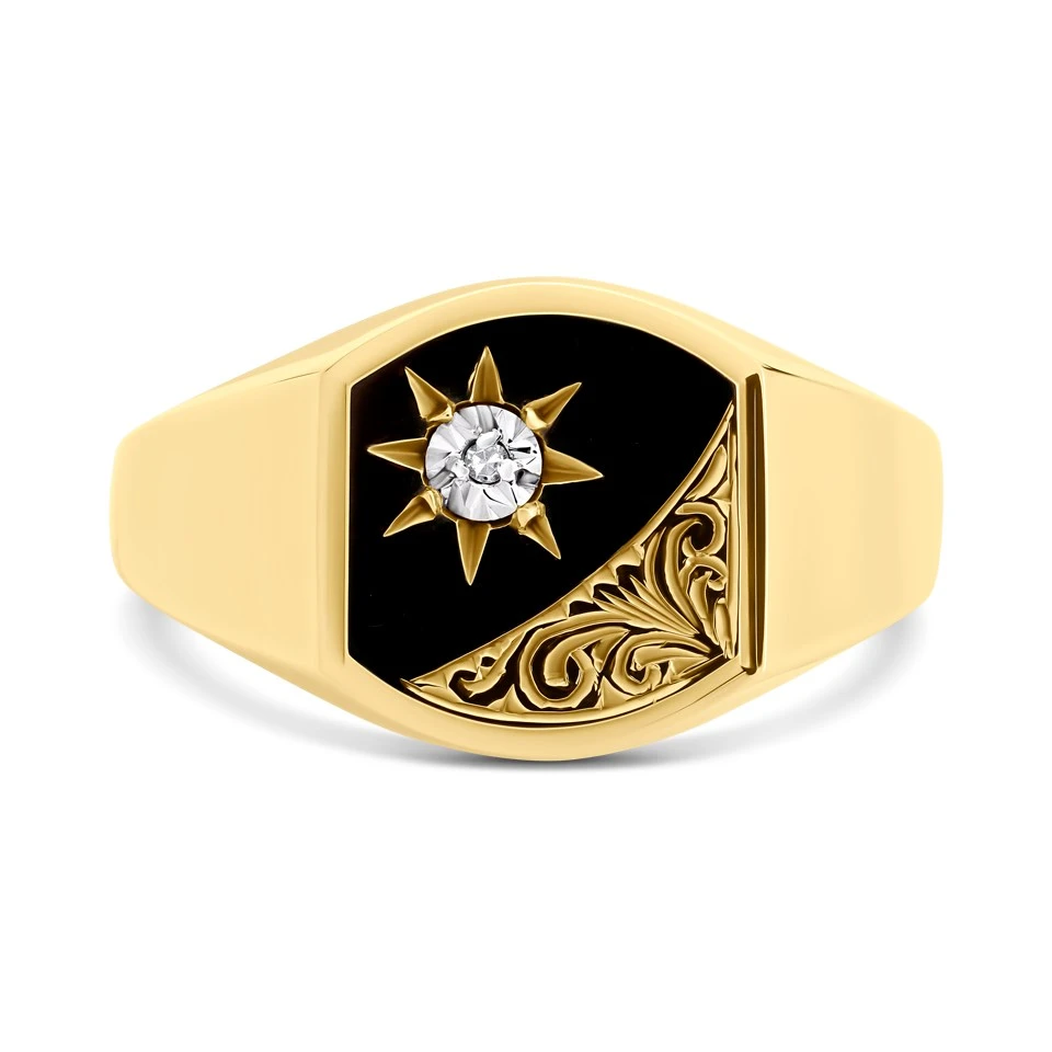 A traditional gold signet ring set with diamond and an accompanying engraved pattern. We have just one of these left, available in a size U only.
