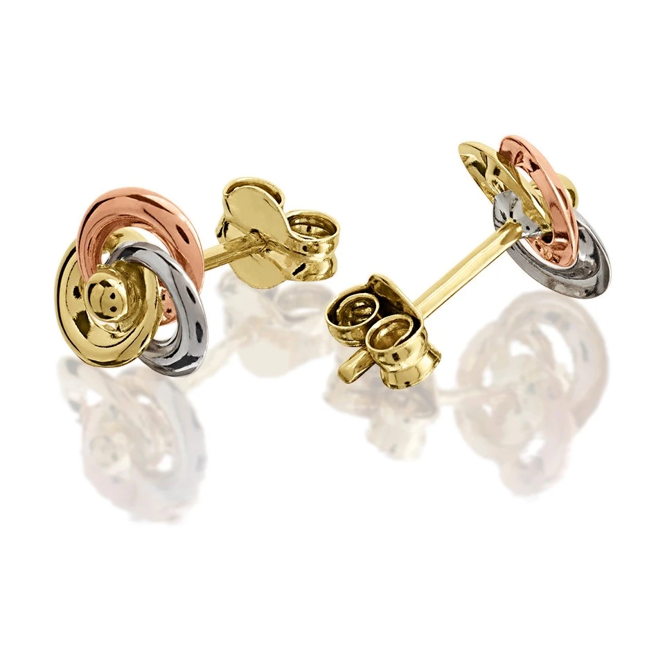 These 8mm wide three colour gold knot stud earrings have a classic design and yellow gold butterfly fittings.