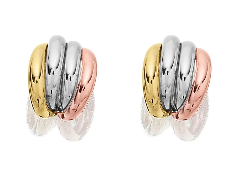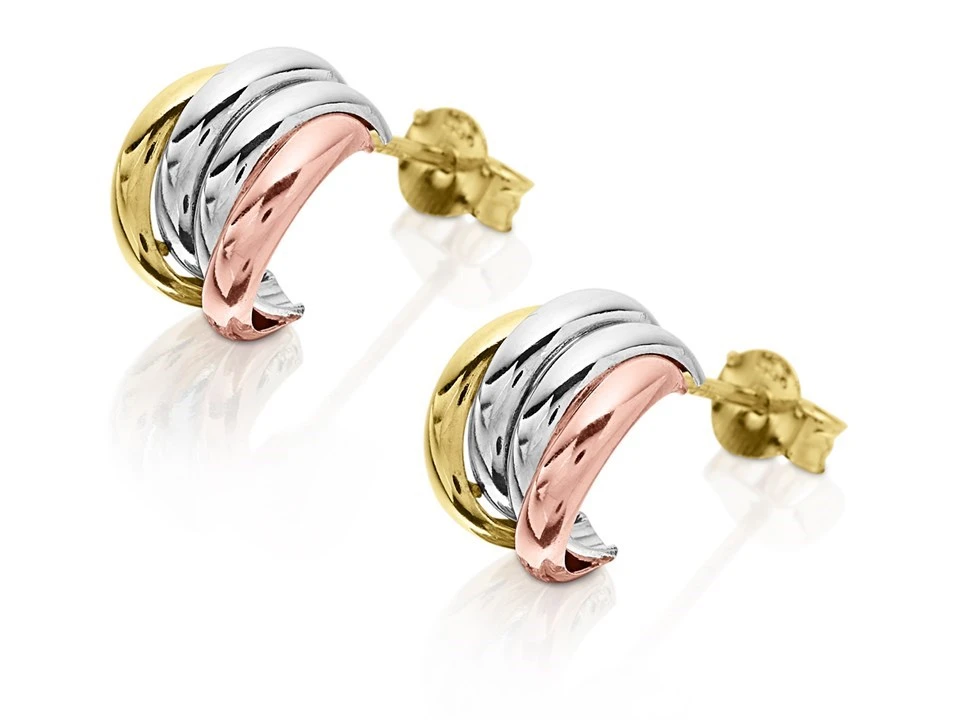 Two inner strands are white, one is rose and the other yellow gold making these versatile and very eye-catching stud earrings, with a nice curve that sits around the ear. 8 x 10mm.
