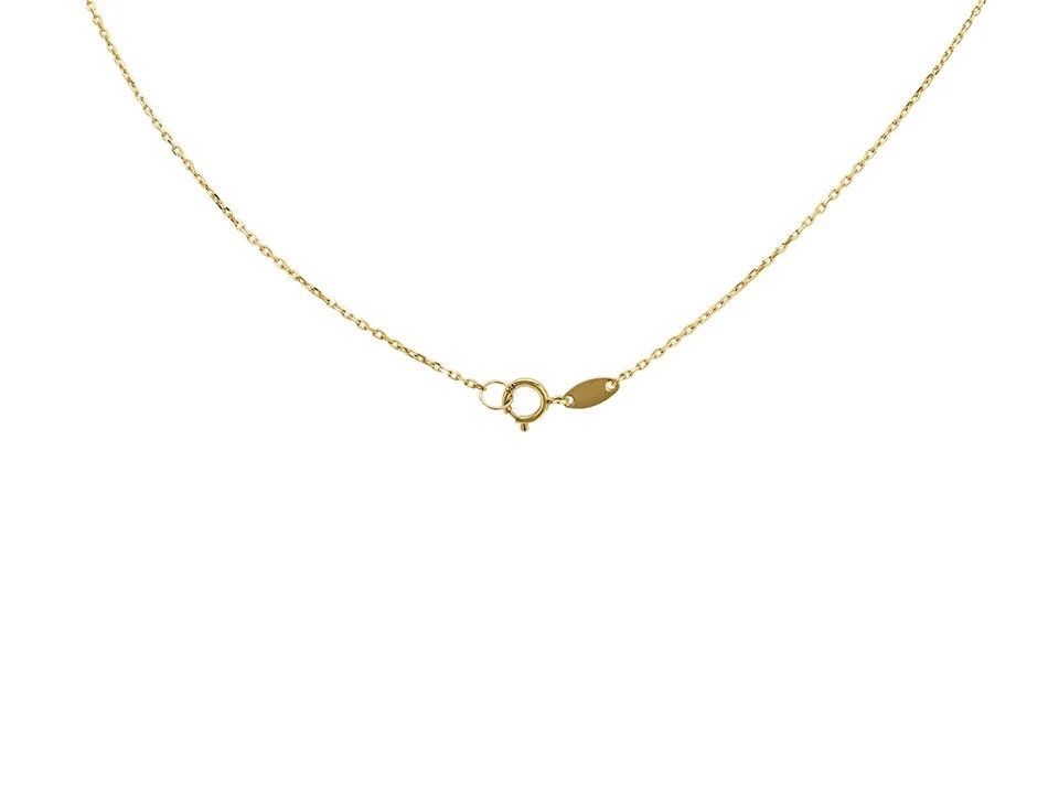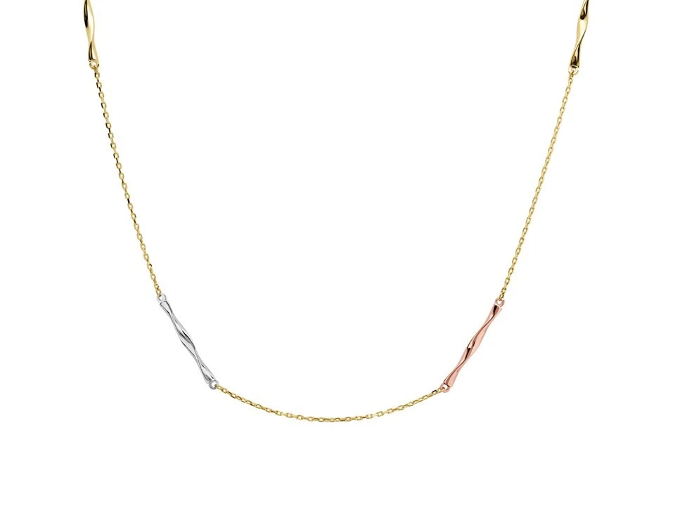 Two yellow, one white and one rose tone 21mm twists are fixed along this 17″/43cm fine gold belcher chain necklace, making it a perfect accessory alongside any outfit.