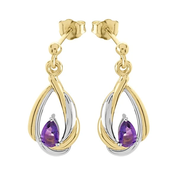 Pretty pear cut amethysts are set in two colour twisted teardrops, making these 9ct gold drop earrings a lovely piece of jewellery. With butterfly fittings and a total drop of 20mm. A February birthstone present option.