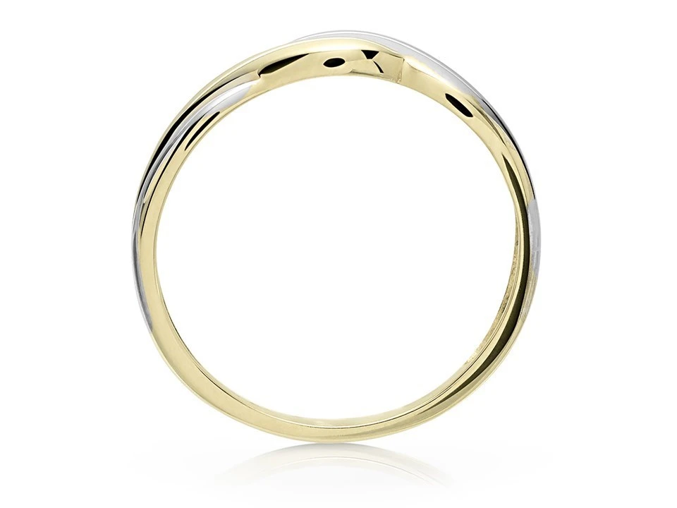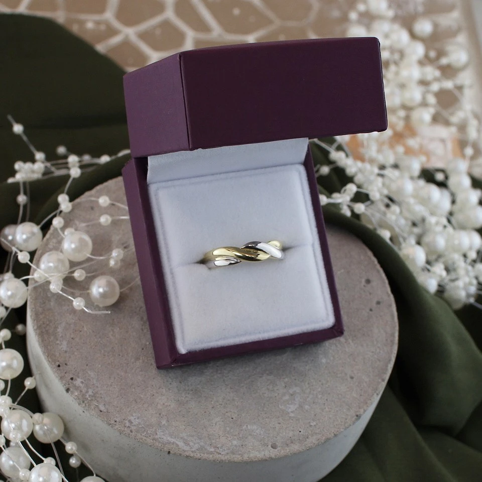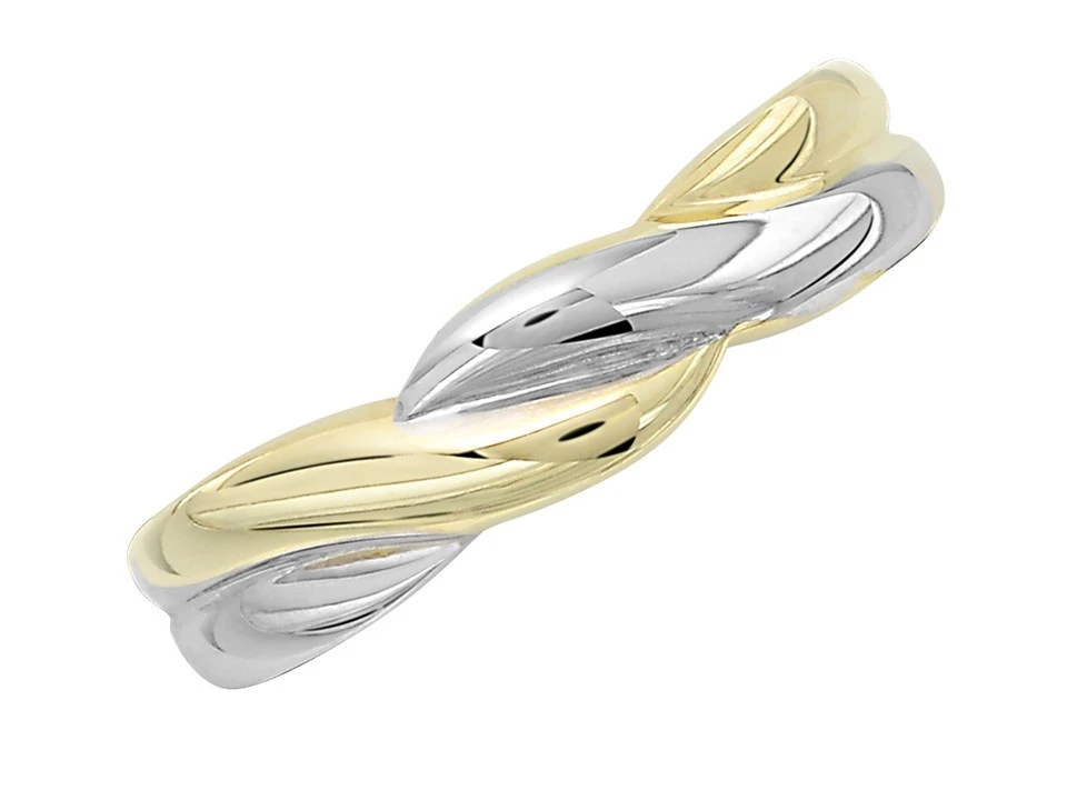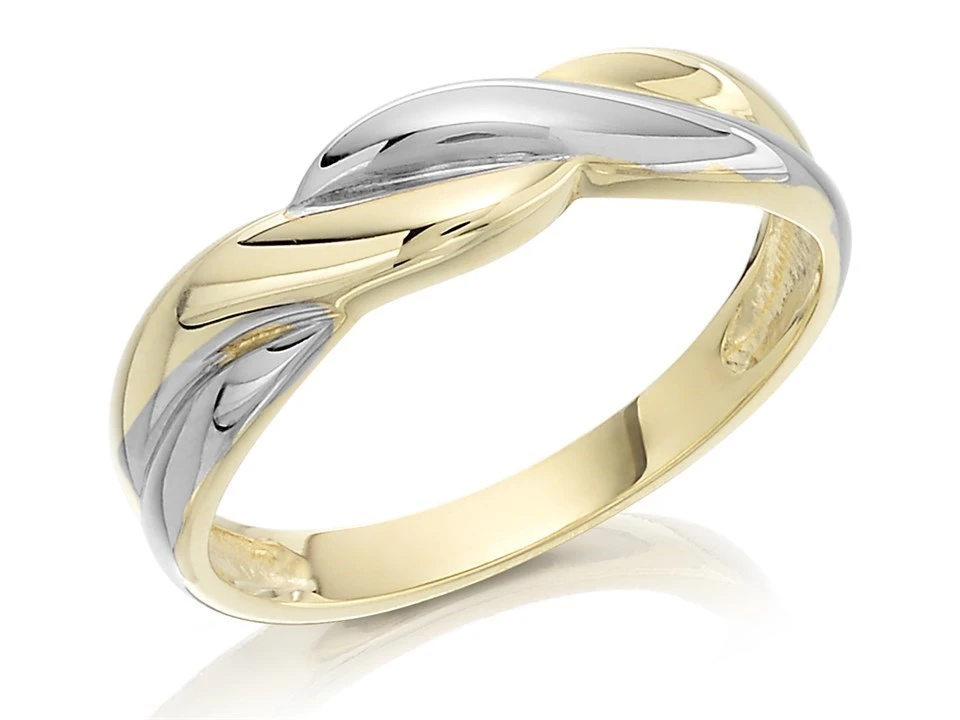 This 5mm wide gold ring boasts a white finish crossover strand that threads prettily around it. An unusual two colour ring that might even be linked with romance.