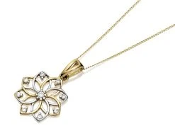 Eight outlined petals create this 12mm pendant, each petal and the centre featuring a cubic zirconia, strung on an 18″/45.5cm fine gold chain. The outline design makes this an interesting and unusual jewellery piece.