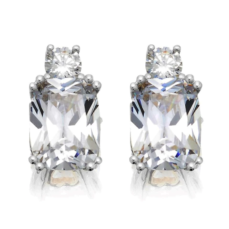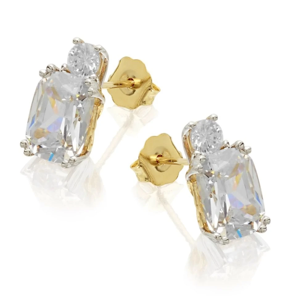 There’s so much in the design of these gold stud earrings to enjoy. Start with the the two cubic zirconias – one a 6 x 8mm rectangle, the other a 3mm round brilliant cubic zirconia at the top, and then there’s the two colour gold setting that holds them. Totel drop 11mm from the ear.