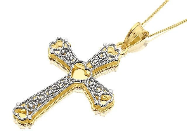 Measuring 20 x 25mm and with hearts at the centre and at the ends, this unusual but romantic filigree cross is yellow gold throughout but boasts a white finish beaded top layer. Strung from an 18in/45.5cm yellow gold curb chain.