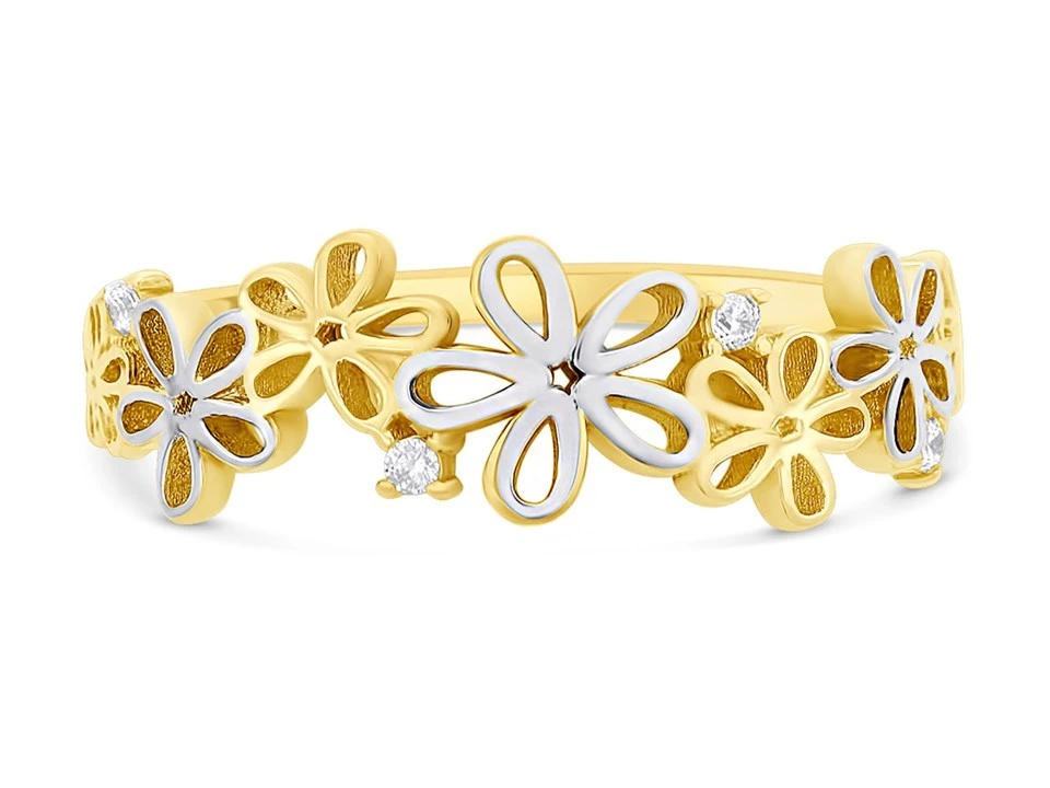 A pretty 9ct gold two colour flower ring with cubic zirconia accents to add a touch of sparkle. Set with a slim band making an attractive piece of jewellery.