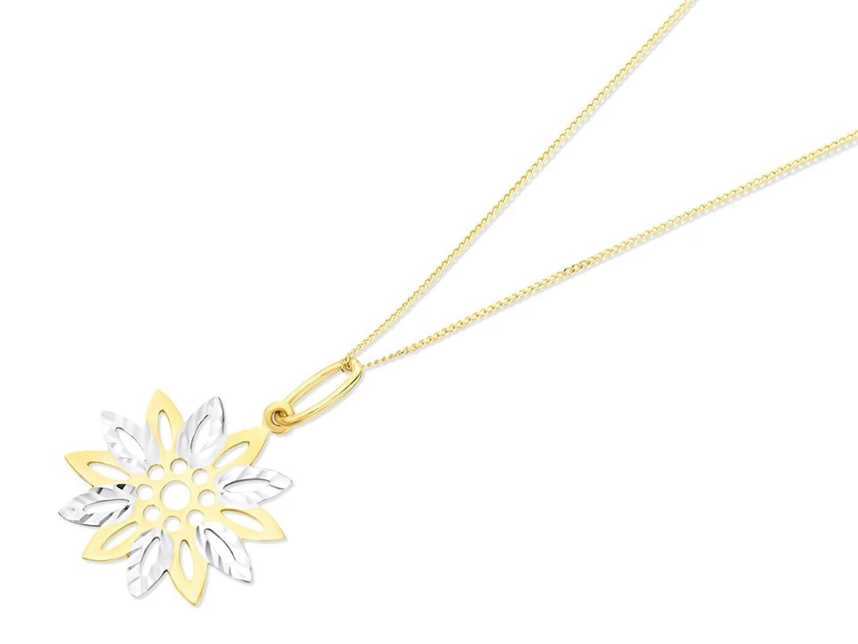 This pretty 16mm 9ct gold two colour flower pendant features diamond cut rhodium plated petals to add a touch of sparkle. Strung from an 18in/46cm fine gold chain.