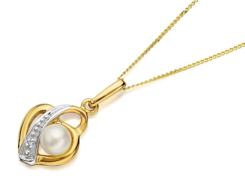 The 4mm white freshwater pearl nestles within the folds of the 12mm heart with a diamond accent right beside it set within a white setting. Strung from an 18″/45.5cm fine yellow gold chain. Exclusive to F.Hinds in the U.K.