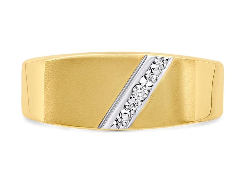 An interesting satin-finish to this 9ct gold signet ring, with a pave set diagonal diamond accent white flash across the front face.
