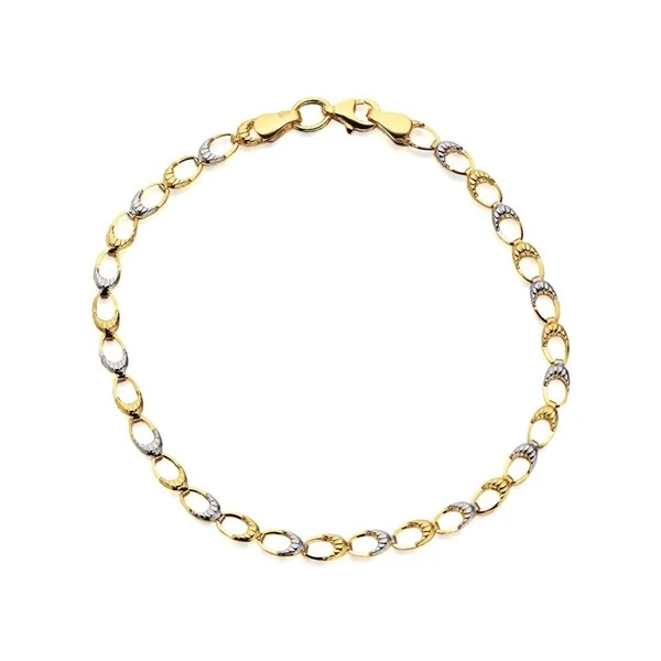 An interesting and unusual two colour bracelet from our extensive collection. 9ct yellow gold links alternate with white-tipped links, with each link just slightly diamond cut for interest and style. 7.25in/18.5cm long and finished with a secure yellow gold karab clasp.