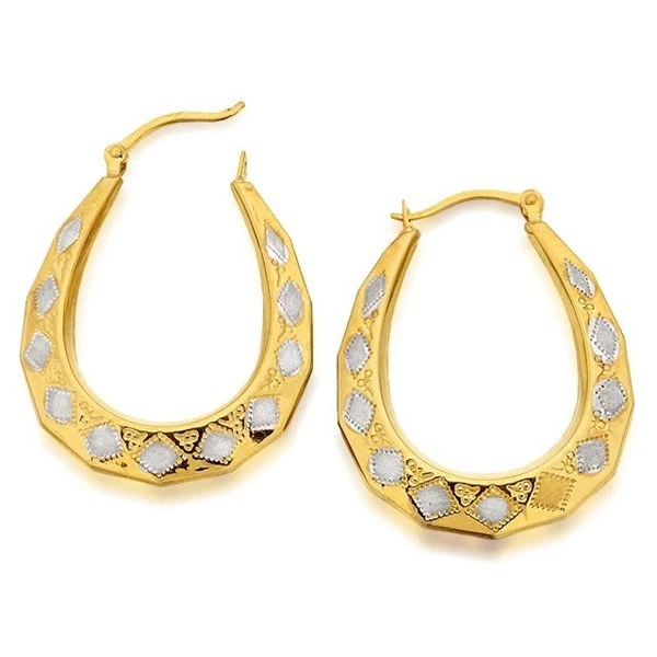 Beaded dots and a diamond shaped patterning adorn the face of these yellow gold creole hoop earrings, with easy to use snap shut fittings and modern white coloured accents. Approximate size 22 x 28mm.