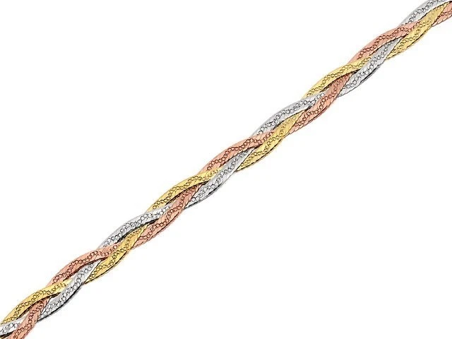 Three strands of white, yellow and rose gold are plaited together to create this flat lying, 17in/43cm x 3mm wide herringbone necklet.