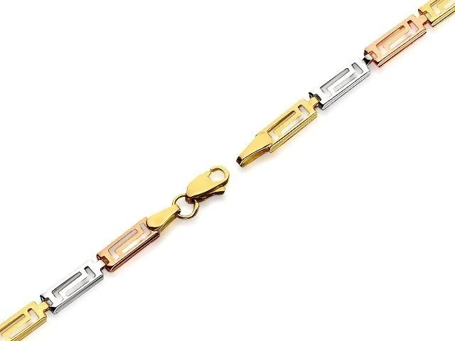 9ct rose, white and yellow gold links each in a greek key pattern create this unusual 4mm x 7.25in bracelet, finished with a karab clasp for security.