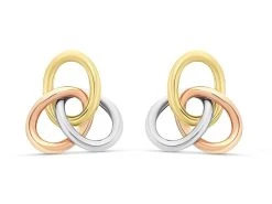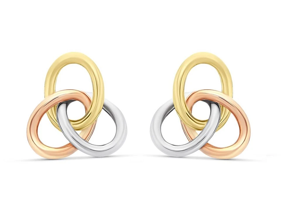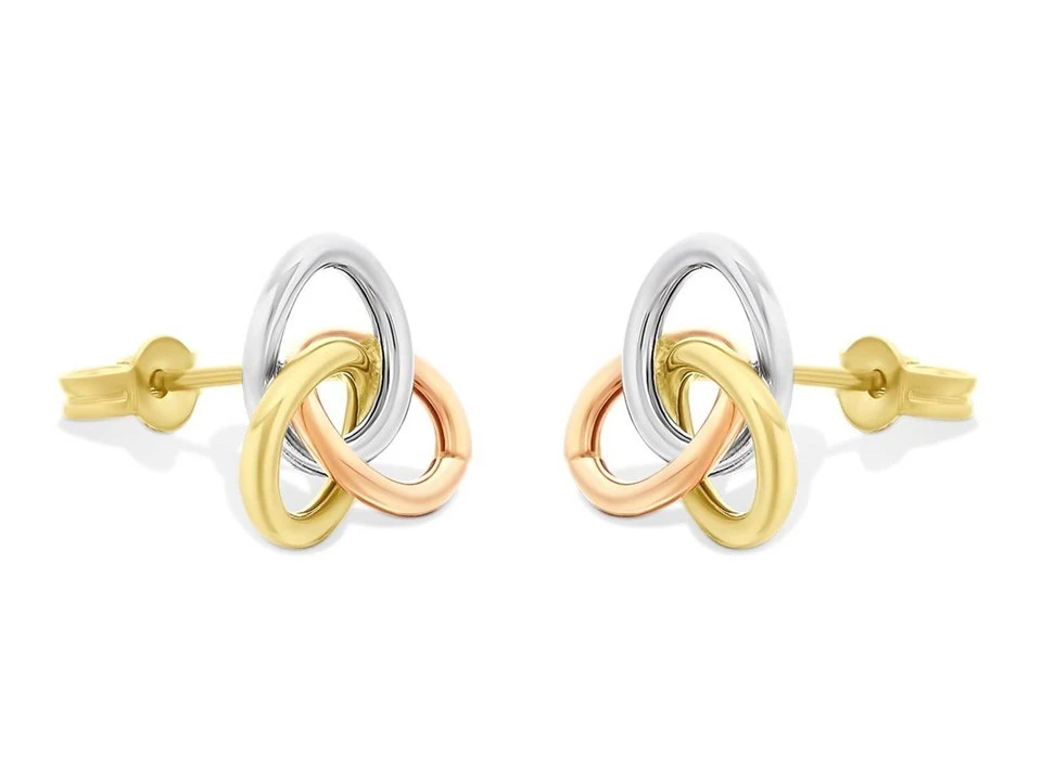An open knot design makes these 9ct three colour gold stud earrings the perfect accessory. Measures 9mm wide and secured with a butterfly fitting.