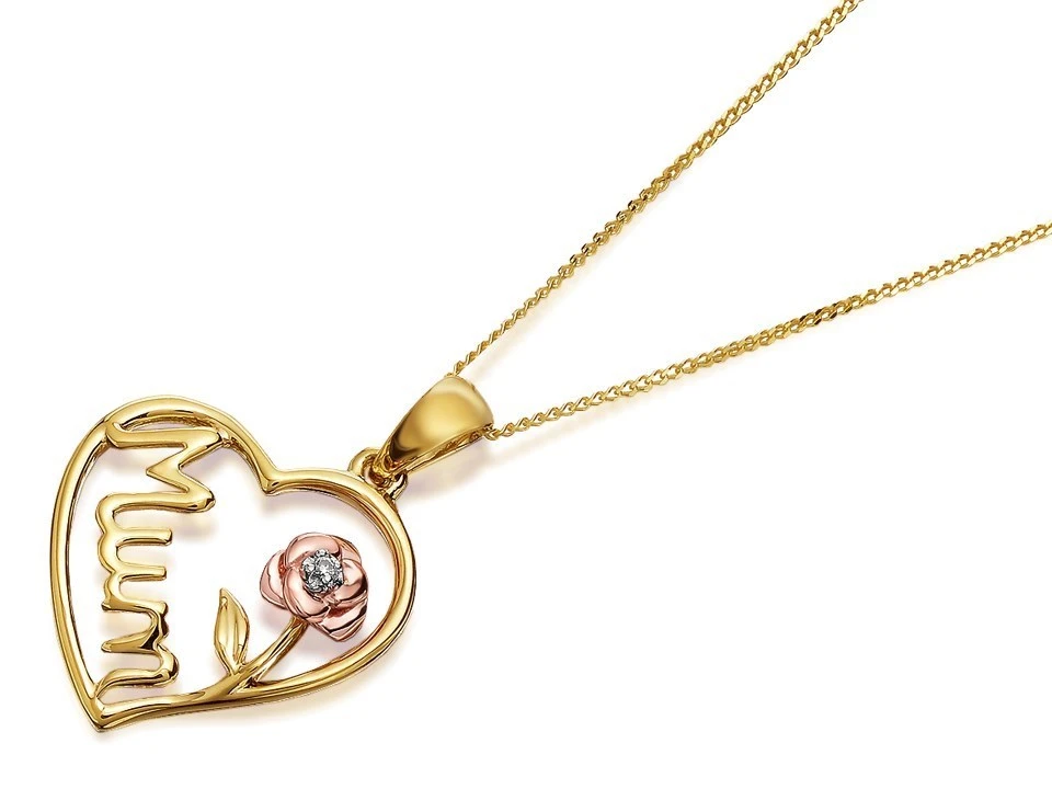 For your special Mum, how about this pretty 12mm open heart that tells her of your love? Also with a diamond set rose gold flower as well, strung from an 18″/45.5cm fine yellow gold chain.