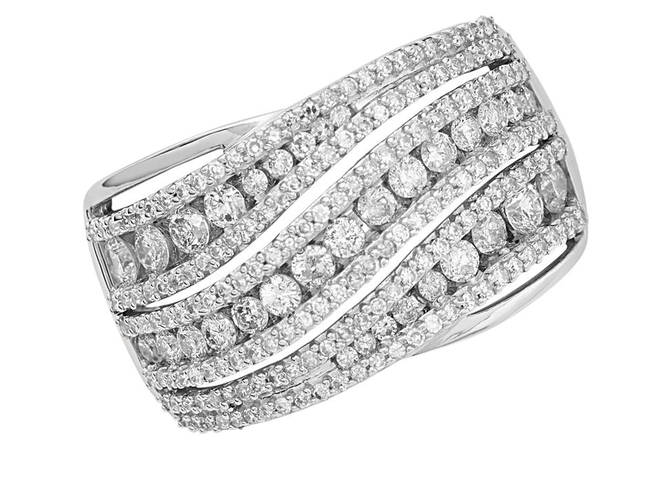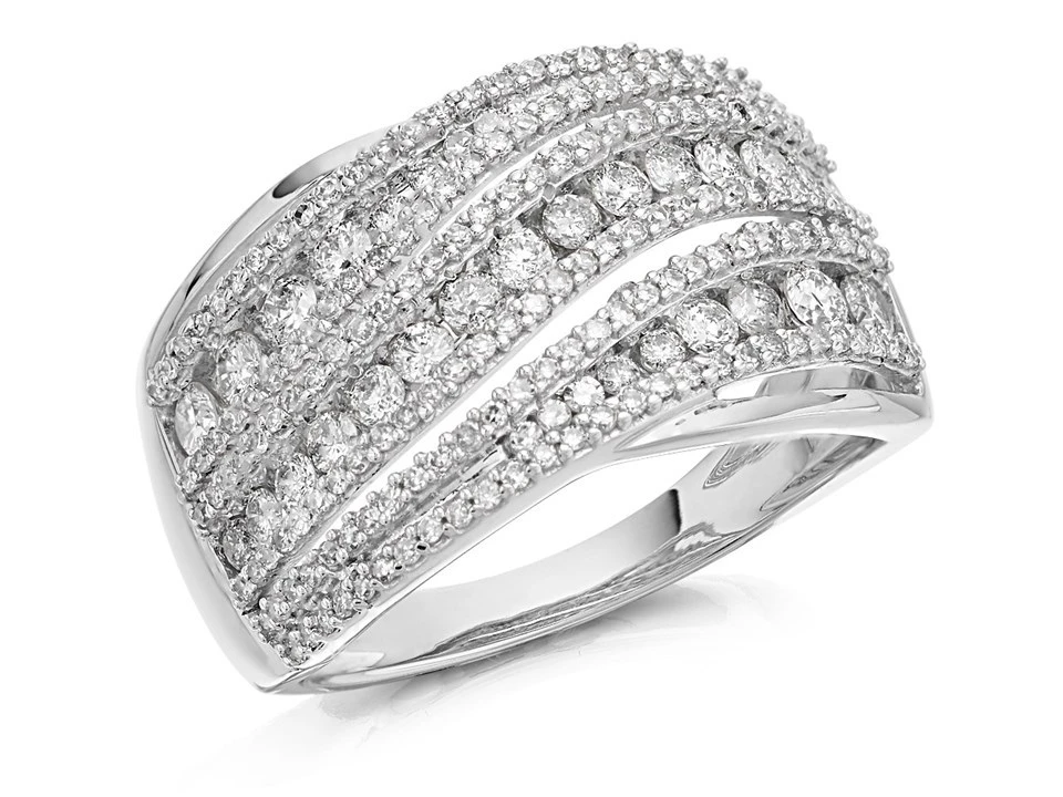 A fantastic white gold diamond band ring featuring an impressive 1 carat of bright white sparkling diamonds. Rows upon rows of round brilliant cut diamonds are set in a pretty diagonal wave across the finger making this band ring a real head turner.