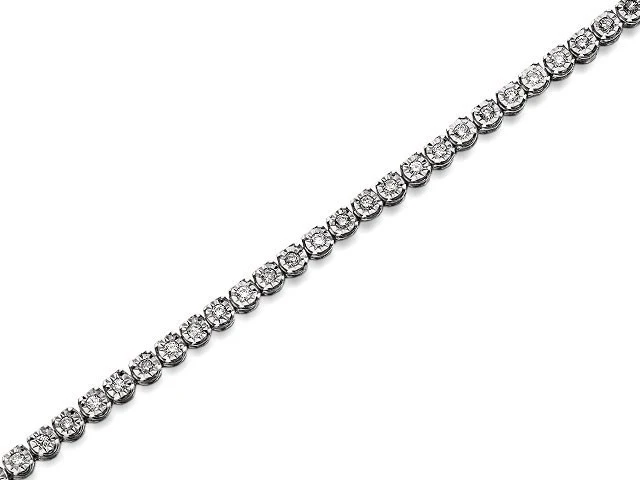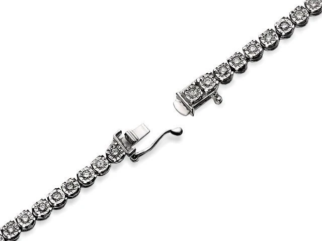 Fifty one round brilliant cut diamonds are placed within illusion settings along this stunning 7.25”/18cm white gold tennis bracelet. Total diamond weight 1 carat, diamonds graded minimum colour H-I, clarity I3. Finished with a tongue and groove clasp and fold over safety catch.