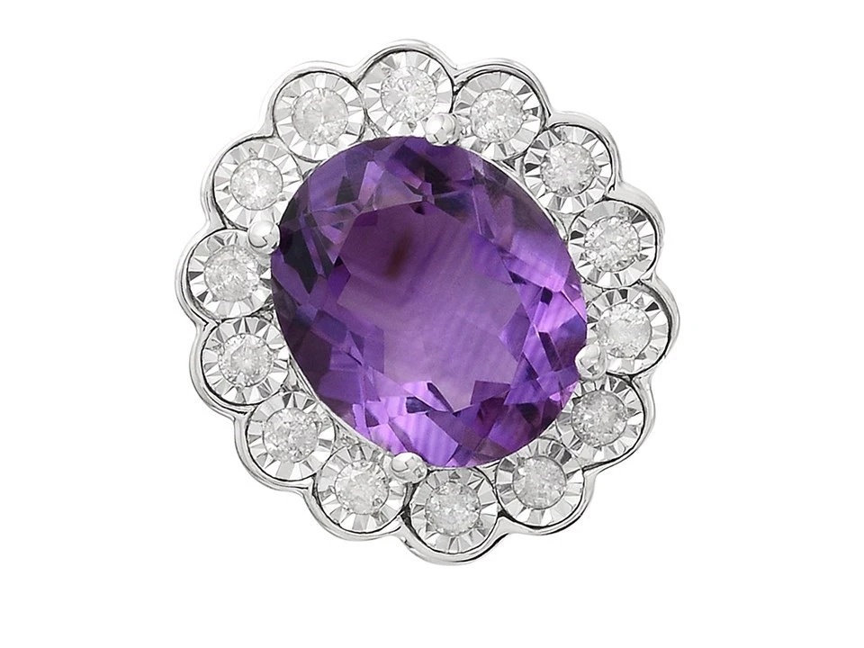 A stunning and dramatic white gold cluster ring boasting a large, 10 x 12mm purple amethyst that’s encircled by diamonds (1/3ct total diamond weight), all within a 9ct white gold setting with an attractive frilled edge around it. Available in selected sizes only.