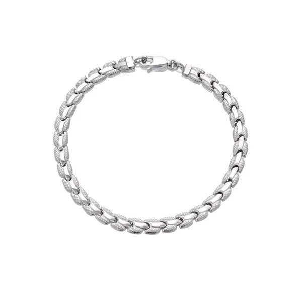 A line up of little white gold arrowhead links boast attractive etched edges and together create this flexible and very wearable 4.5mm wide x 7.25″/19cm bracelet. Finished with a white gold karab clasp.