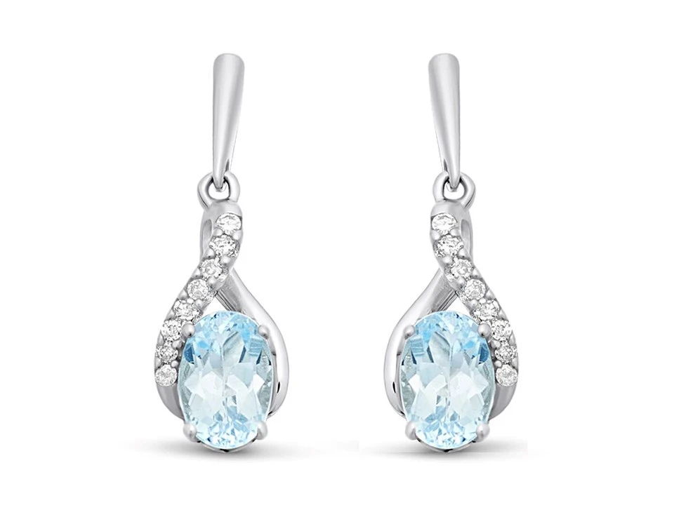 Perfect for a November birthday, these 9ct white gold blue topaz and diamond drop earrings feature a crossover design. The 4 x 5mm oval cut blue topaz is enhanced with a wave of diamonds. Total drop 17.5mm and secured with a butterfly fitting.