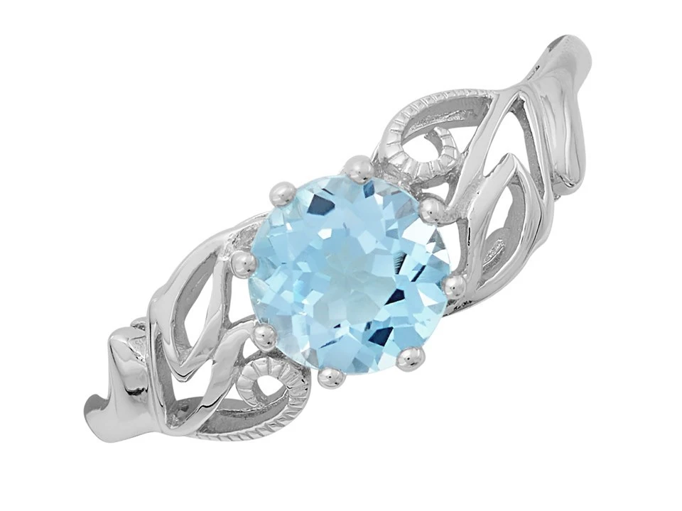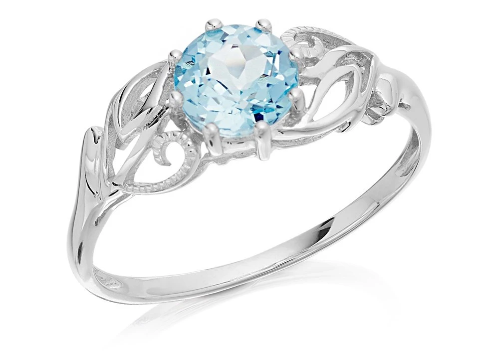 A charming, very pretty, open-cut leaf scroll holds the blue topaz in an eight claw setting at the centre, on a 2mm 9ct white gold setting.