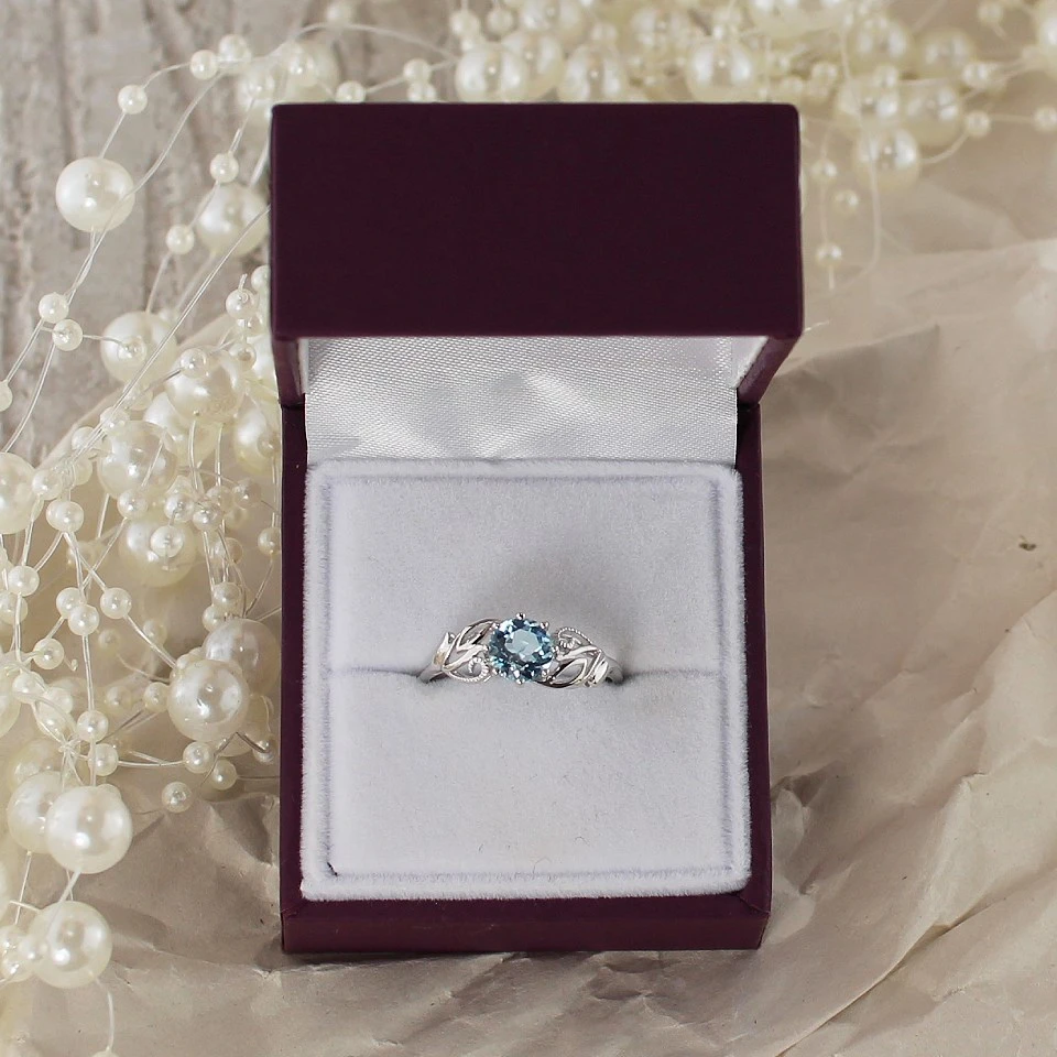 Be the first to review “9ct White Gold Blue Topaz Leaf Scroll Ring – R0942” Cancel reply