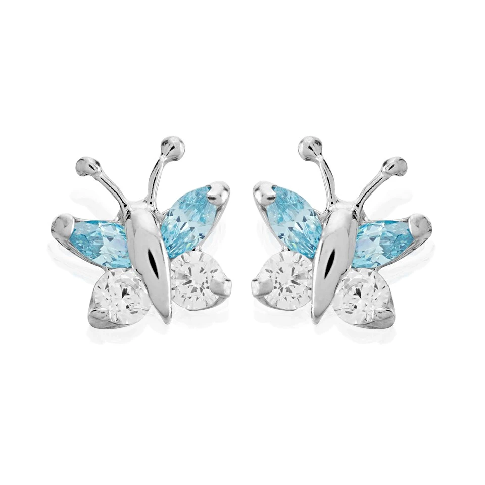 Pretty 9ct white gold butterfly stud earrings set with blue and white cubic zirconias for the wings. A lovely addition to any jewellery collection, 5mm wide.
