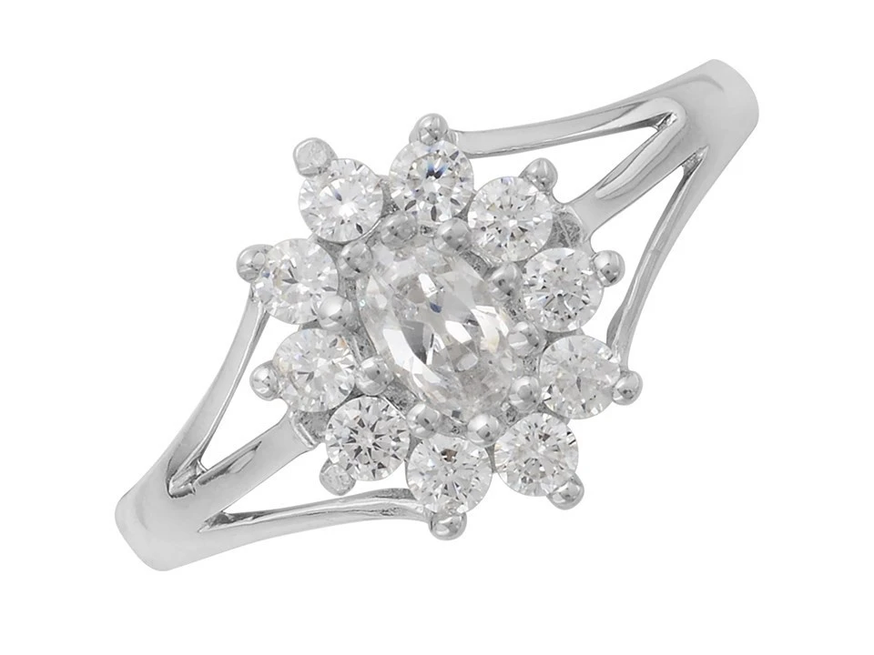 A very pretty white gold flower ring with a large oval stone at the centre surrounded by ten smaller stones, together creating an 11 x 8mm cluster. The shoulders split in three to add to the design.