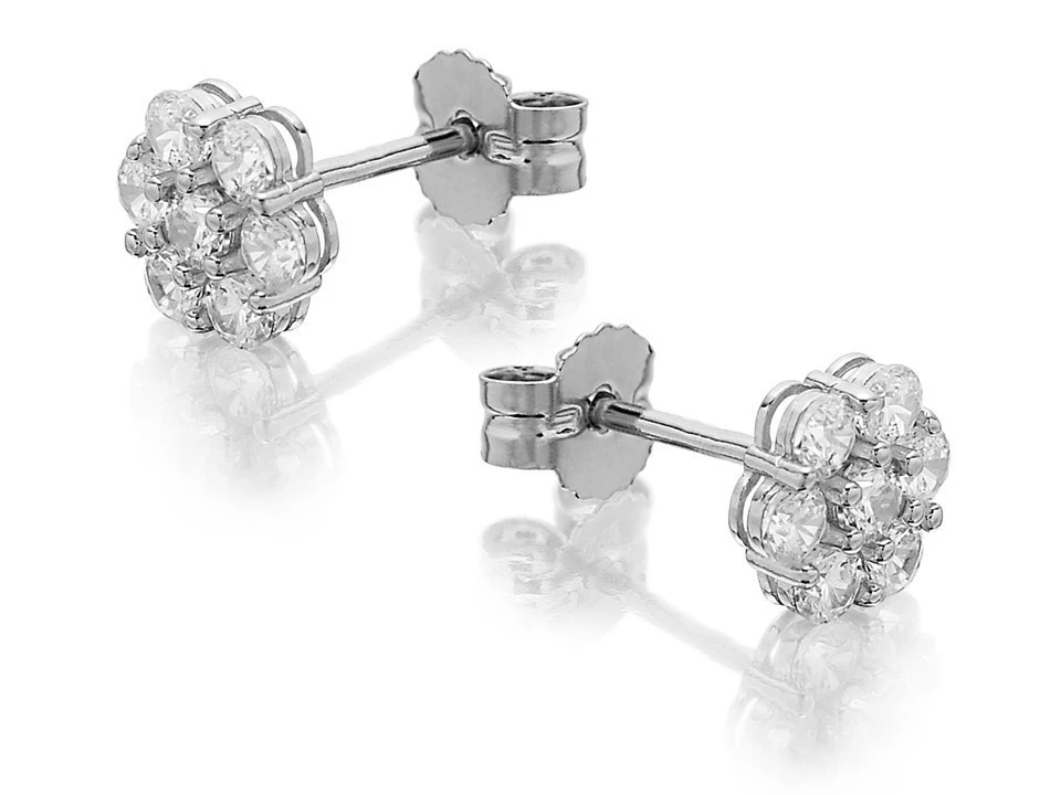Seven sparkly white cubic zirconias together create these 5mm white gold cluster stud earrings. Secured with white gold butterfly backs.