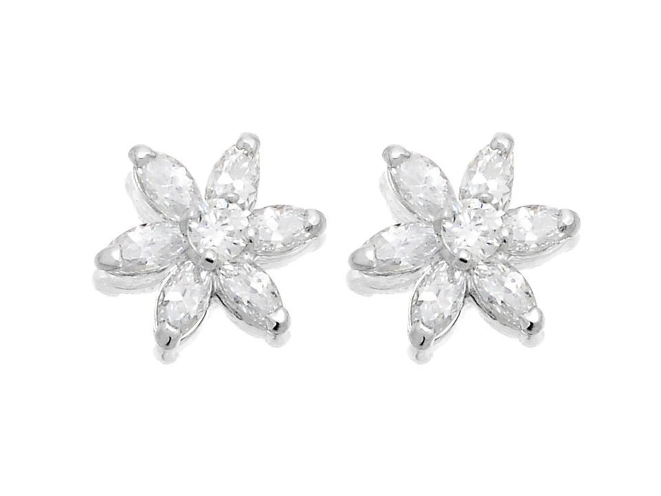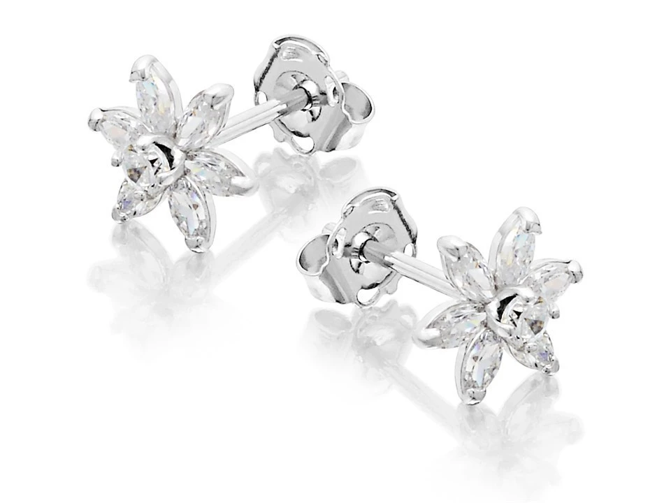 He loves me, he loves me not – six cubic zirconia petals, with a round cubic zirconia at the centre, 7mm wide, finished with white gold butterfly scrolls.