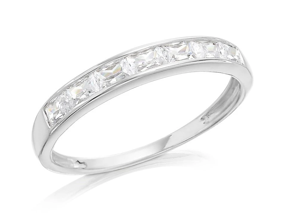 Seven baguette cut cubic zirconias, horizontally channel set to create the impressive 3mm wide front face of this white gold half eternity ring. Exclusive to F.Hinds in the U.K.