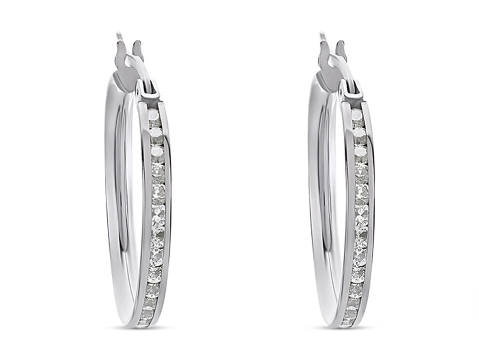 The channel set cubic zirconias add a touch of sparkle to these 15mm wide 9ct white gold hoop earrings. Finished with snap shut fittings.