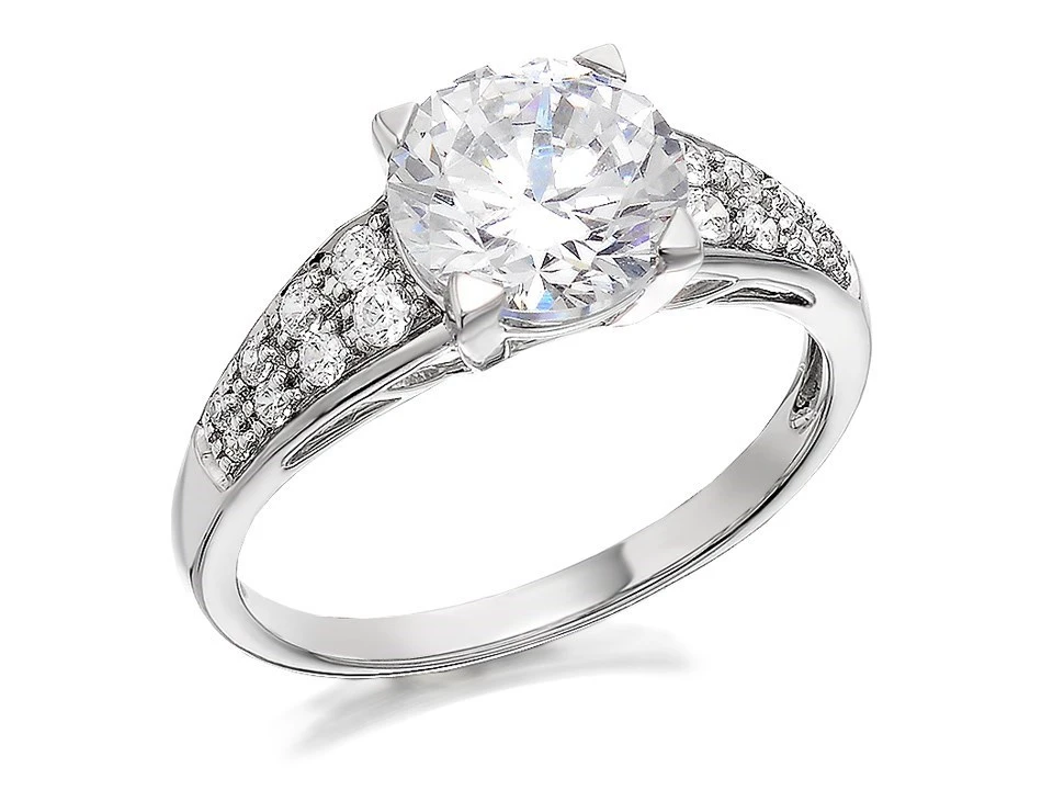 An impressive 8mm cubic zirconia is the central and main focus of this ring, with the addition of eight more, graduated size cubic zirconias on each shoulder – many will be unable to tell the difference! Exclusive to F.Hinds in the U.K.