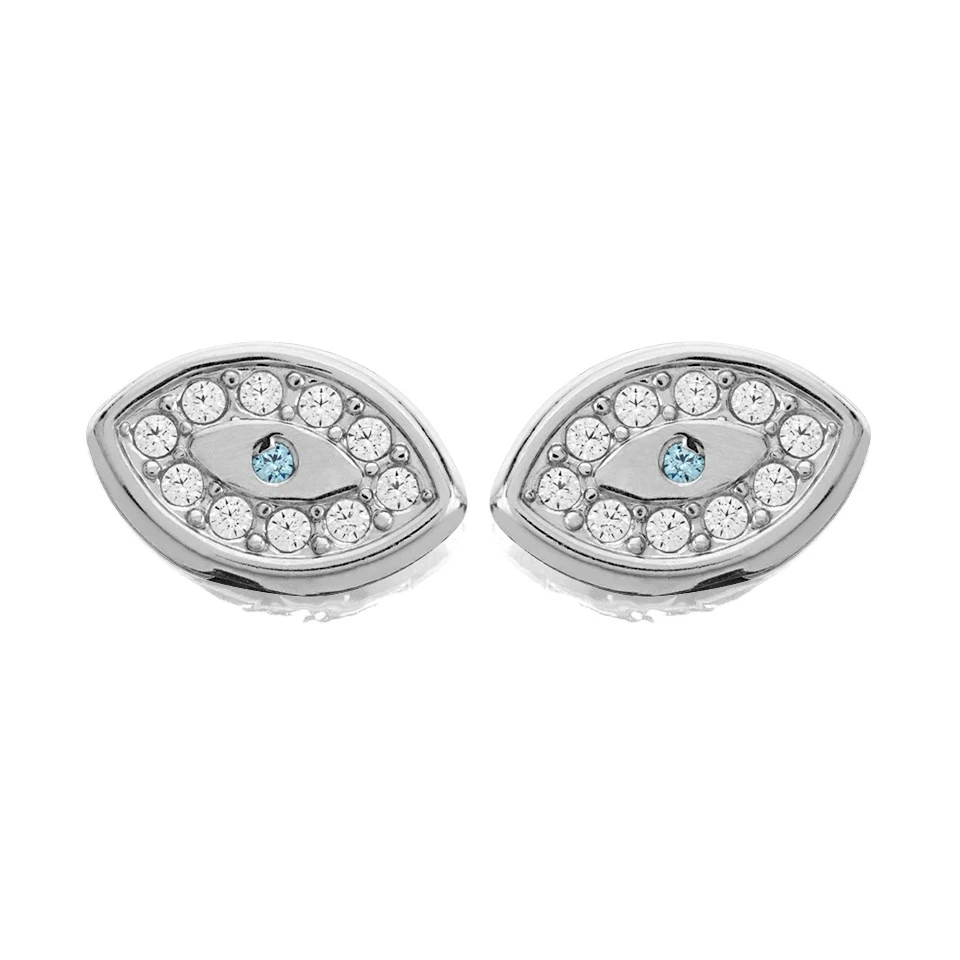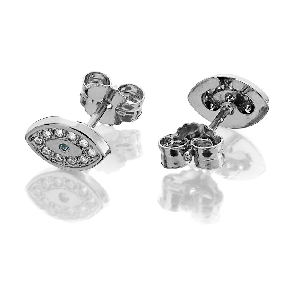 Set with cubic zirconias to greate an evil eye design, these 7 x 4mm 9ct white gold stud earrings make an interesting gift option. Fitted with white gold butterfly backs.