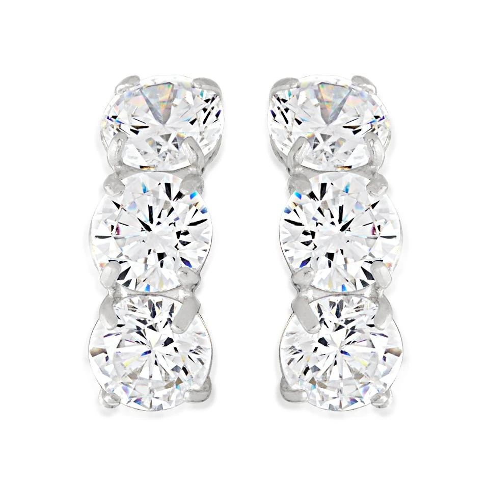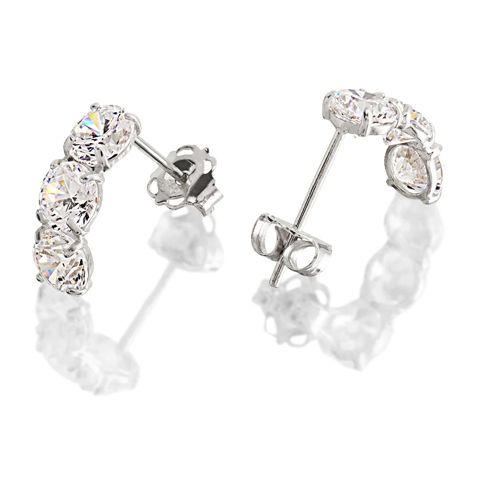 Set with three, 4mm cubic zirconias in a half hoop wedding style stud, these 11mm long 9ct white gold earrings will look fabulous with any outfit. Secured with white gold butterfly fittings.