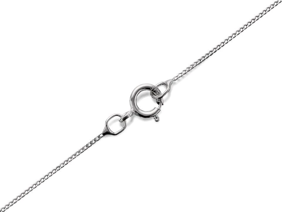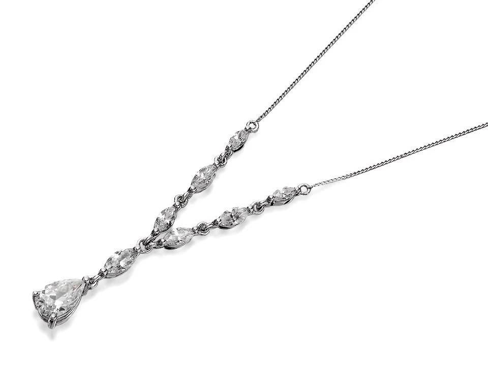 The perfect degree of delicacy and sparkle – seven marquise-shaped cubic zirconias, six for the necklet plus one for the dropper, lead to the larger pear-shaped drop at the end, strung from a fine curb chain, sits at 18in/45.5cm.