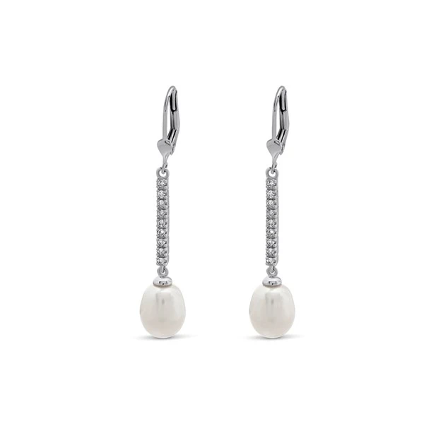 Designed to add sophisticated sparkle, these 9ct white gold diamond and pearl earrings have a continental fitting. With a total drop of 46mm, the 17.5mm diamond set bar has an 8mm wide oval cultured freshwater pearl hanging from the end. 15pts total diamond weight for the pair.