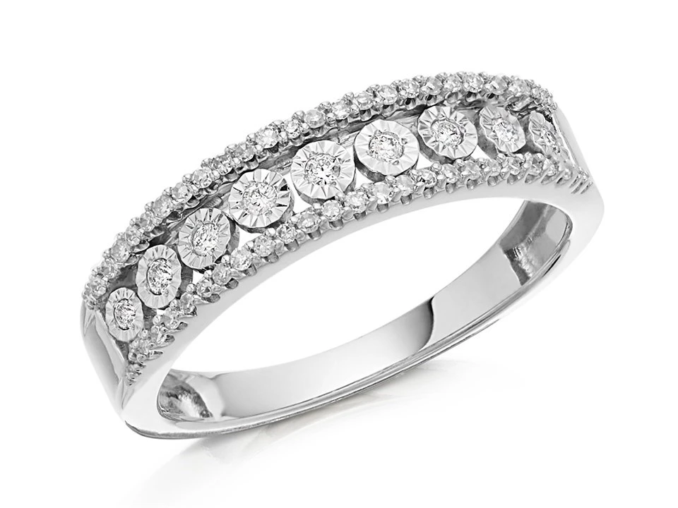Nine diamonds in a pretty radiating setting sit within the centre of the 5mm wide band, with lots of little diamonds in a raised edge both sides (20pts total diamond weight).